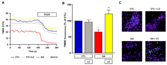 Mitochondrial respiration impairment and ATP depletion may be strictly correlated with the loss of the Δψm, and, in this regard, a decreased Δψm was observed in AD animal models and in human cortical neurons ex vivo [9,10,11]. For this reason, we sought to investigate the effect of chronic GA treatment on the Δψm and evaluate any possible effect induced by LC. As shown in Figure 4, in rat primary cortical neurons, the GA challenge induced a significant decrease in the Δψm. Notably, LC did not modify the Δψm under resting conditions, but it significantly inhibited the mitochondrial depolarization induced by GA exposure.
