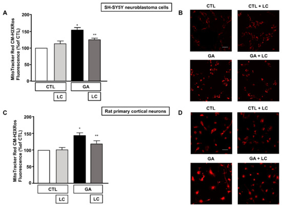 Alteration of the cell energy production and impairment of the Δψm can enhance the production of ROS by favoring improper electron transportation in the mitochondrial respiratory chain [10,50]. We have previously shown that GA can perturb the overall oxidative status of the cell [15], and several reports have described the ability of LC to act as a radical scavenger [30,33,34,35]. Therefore, we sought to explore whether LC could also manifest neuroprotective effects by preserving redox balance. In line with our specific interest, we tested the antioxidant properties of LC against the formation of ROS in mitochondria. When cells were pretreated with LC for 1 h and then exposed to GA for 24 h (without removing LC), mitochondrial ROS production significantly decreased (Figure 5). Interestingly, this effect was observed in both SH-SY5Y cells and in rat primary cortical neurons. LC did not significantly modify the mitochondrial ROS levels under the control conditions (Figure 5).