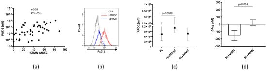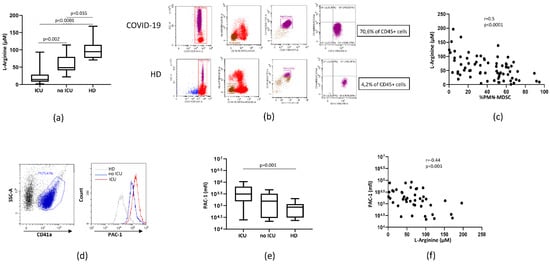 Next, we evaluated whether PMN-MDSCs were directly involved in platelet activation. We found a positive correlation between PAC-1 platelet expression and PMN-MDSC frequency (Figure 2a), suggesting that PMN-MDSC may be involved in arginine deprivation. To confirm that PMN-MDSC may induce platelet activation, we cultured platelet rich plasma (PRP) from HD with PMN-MDSCs isolated from COVID-19 patients and, after 4 h, the expression of PAC-1 on platelets was evaluated by flow cytometry. We found that PMN-MDSCs from COVID-19 were able to activate resting healthy platelets by increasing the expression of PAC-1 (Figure 2b,c). As a control, PBMC depleted from MDSCs were used and no effect was observed. Accordingly, a reduction of L-arginine in the culture supernatants (Figure 2d) was found, indicating that PMN-MDSCs may activate platelets by depriving L-arginine from the microenvironment.