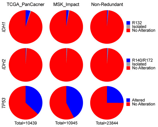IDH1 and IDH2 alterations are rare in human cancer. Recurrent Arg132 mutation (R132) in IDH1, isolated genetic events (isolated), and no alteration were extracted from the TCGA_PanCancer, MSK_Impact, and Non-Redundant datasets. IDH2 Arg140 and Arg172 (R140/R172) mutations and TP53 alterations were analyzed similarly.