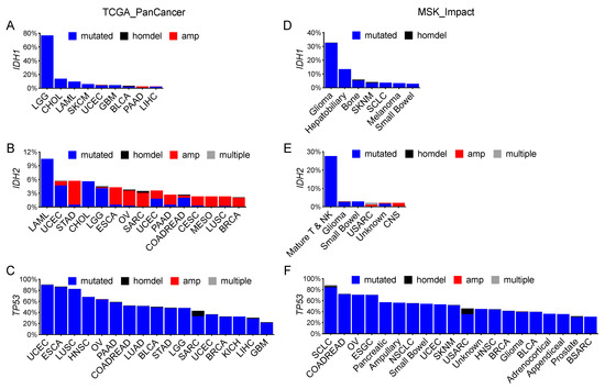 The frequency of IDH1 mutation in lower-grade glioma, however, was conspicuously high (77%) in TCGA_PanCancer, with cholangiocarcinoma and acute myeloid leukemia much lower at 14% and <10%, respectively (Figure 2A). IDH2 mutation was most common in acute myeloid leukemia (11%), followed by <6% in cholangiocarcinoma; however, IDH2 amplification was more common, albeit at low frequencies, among various cancer types (Figure 2B). In MSK_Impact, IDH1 alteration was 33% in various types of gliomas and 14% in hepatobiliary cancer (Figure 2D), whereas IDH2 mutation was seen most frequently in mature T and NK neoplasms (Figure 2E). In Non-Redundant, the frequency of IDH1 mutation was 100% in lower-grade glioma, and cancer types with IDH2 mutation >10% included acute myeloid leukemia, myelodysplastic syndromes, and primary central nervous system lymphoma (Figure S1A,B). Again, IDH2 amplification was seen particularly in prostate adenocarcinoma, pancreatic adenocarcinoma, melanoma, and invasive breast carcinoma. In contrast, TP53 mutation was widespread among various cancer types (Figure 2C,F and Figure S1C). Therefore, although both IDH1 and IDH2 mutations are rare events in human cancer, the prevalence of IDH1 mutation in lower-grade glioma suggests a tissue-specific role in tumorigenesis.