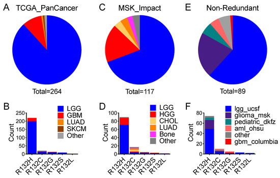Co-occurrence of IDH1 hotspot mutation and TP53 alteration is predominantly in glioma. Analysis of TCGA_PanCancer (A,B), MSK_Impact (C,D), and Non-Redundant (E,F) datasets reveals co-occurrence of IDH1 hotspot mutations and TP53 alterations overwhelmingly in glioma and rarely in other cancer types, as presented in pie charts (top) and column charts (bottom) where sample counts of the cancer types are in reference to specific types of IDH1 mutation. Of note, the cancer types in pediatric_dkfz (F) are high-grade glioma.