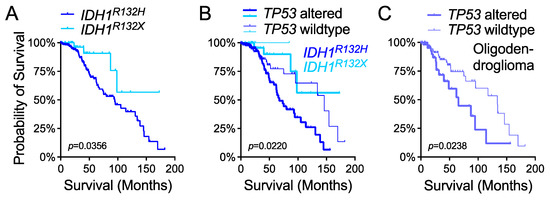 Relevant data were extracted and processed with GraphPad Prism version 9.0 software (GraphPad Software, San Diego, CA, USA) to present genetic alteration frequency and occurrence. Statistical significance in frequency difference was determined by paired t-test or Fisher’s exact test, as specified, with two-tailed p-values. Overall survival was analyzed by the Mantel-Cox log-rank test as previously described [30,31]. Multivariate Cox proportional hazards analysis was performed with SPSS Statistics (IBM) software by including TP53 status, IDH1 status, age, sex, and histological type, as previously described [31].