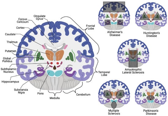 Neurodegenerative disease localization in relation to areas of the brain and the central nervous system. On the left, key parts of the brain are labeled. On the right, regions of the brain that have been identified to be affected by specific neurodegenerative diseases are highlighted. AD has been identified to affect the hippocampus, cingulate gyrus, and many cortical regions []. HD affects the caudate, cerebral cortex, putamen, and global pallidus []. ALS affects the medulla oblongata, pons, corpus collosum, and thalamus []. MS affects the putamen, global pallidus, caudate, thalamus, and medulla [,]. PD affects the substantia nigra in the mid-brain most significantly []. Figure created with BioRender.com.