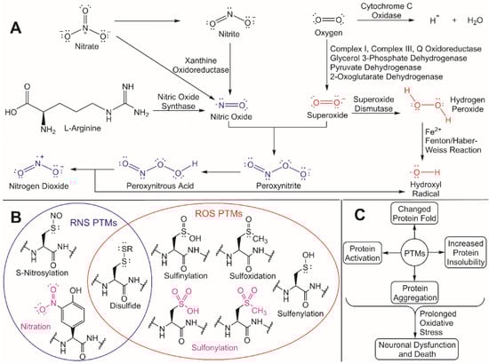 Production of reactive species and corresponding PTMs induced by oxidative stress. (A) RNS (blue) and ROS (red) are produced by various enzymes and reactions. Nitric oxide is produced from nitrate and nitrite (catalyzed by xanthine oxidoreductase) and L-arginine (catalyzed by the nitric oxide synthases) [,,]. In the mitochondria, oxygen is reduced to H+ and H2O by cytochrome c oxidase to promote the production of ATP in the electron transport chain []. Superoxide is generated as a byproduct in the mitochondria via complex I, complex II, Q oxidoreductase, glycerol 3-phosphate dehydrogenase, pyruvate dehydrogenase, and 2-oxoglutarate dehydrogenase [,]. Superoxide is then either catalyzed by superoxide dismutase to form H2O2 or reacts with nitric oxide to produce peroxynitrite [,]. H2O2 will undergo an iron-dependent Fenton reaction (also referred to as a Haber–Weiss reaction) to produce a hydroxyl radical [,,], and peroxynitrite will be reduced to generate peroxynitrous acid and can decompose to produce nitrogen dioxide and a hydroxyl radical []. (B) Reversible (black) and irreversible (magenta) post-translational modifications that are caused by reactive nitrogen species (within the blue circle) and reactive oxygen species (within the red oval). Reversible modifications of cysteine residues caused by reactive nitrogen species include S-nitrosylation and disulfide bond formation, while an irreversible modification caused by reactive nitrogen species includes tyrosine nitration []. Reversible modifications caused by reactive oxygen species include disulfide bond formation (cysteine), sulfinylation (cysteine), sulfoxidation (methionine), and sulfenylation (cysteine). Irreversible modifications caused by ROS include sulfonation of cysteine and methionine residues []. (C) The PTMs generated by ROS and RNS can activate proteins, alter the 3D fold of a protein, increase protein insolubility, and/or cause protein aggregation [,]. When oxidative stress is prolonged, these physiological effects can lead to neuronal dysfunction and death.