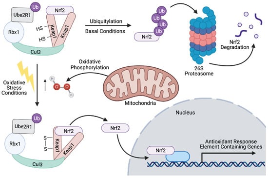 The Nrf2 transcription activation system is also tightly regulated through ubiquitylation via Kelch-like ECH-associated protein 1 (Keap1). Keap1 is a RING E3 ubiquitin ligase that utilizes PTMs to form a disulfide bond between two of its cysteine residues, causing a conformational change that inhibits Nrf2 ubiquitylation (Figure 3). This in turn inhibits Nrf2 degradation via the 26S proteasome and allows for Nrf2 nuclear localization upon excess H2O2 accumulation from mitochondrial metabolism [].
