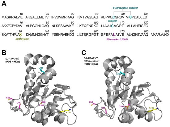 DJ-1 is a ubiquitously expressed, redox-sensitive, dimeric chaperone protein that is involved in dopamine synthesis, aggregated α-synuclein clearance, dopaminergic mitochondrial regulation, and oxidative stress-induced transcription regulation [,,,]. DJ-1 contains three exposed cysteine residues that are susceptible to oxidation, although the highly conserved Cys106 residue has been shown to have the most detrimental effect in DJ-1 activity [] (Figure 4).