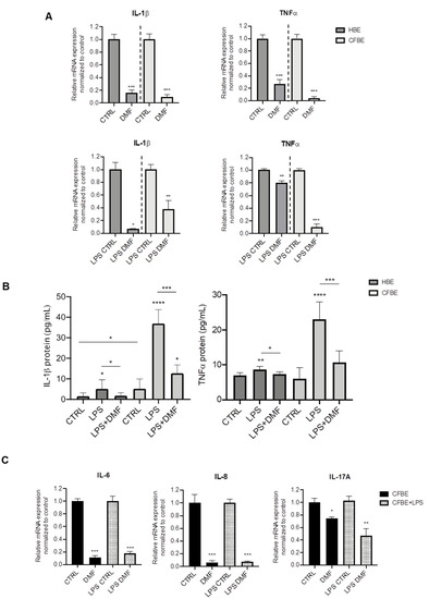 To further explore the anti-inflammatory effects of DMF, other cytokines relevant to CF were tested, i.e., IL-6, IL-8, and IL-17A. Figure 1C shows that basal and LPS-stimulated cytokine expression was abated by DMF regarding IL-6 and IL-8. Interestingly, DMF decreased basal and LPS-stimulated IL-17A by only 30% and 60%, respectively.