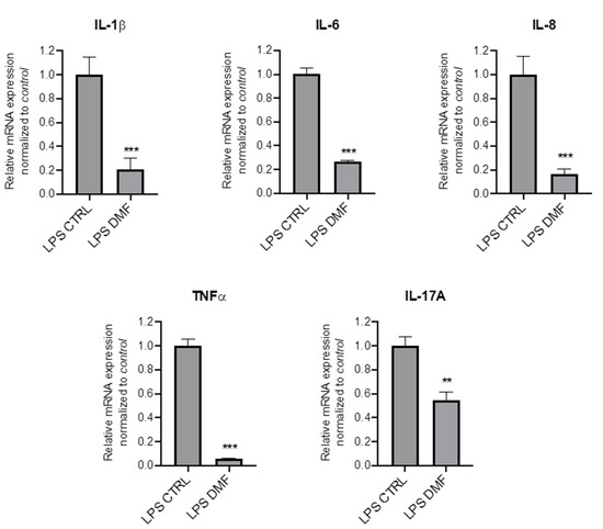 DMF reduces the expression of cytokines stimulated by LPS in CFBE cells. Cells were incubated with 10 µg/mL of LPS for 1 h and afterwards with 0.1% DMSO (CTRL) or 50 µM DMF. Total RNA was extracted and qRT-PCR was performed in order to quantify IL-1β and TNF-α, IL-6, IL-8 and IL-17A mRNA normalized to untreated control. Results are shown as fold induction where CTRL is equal to 1. Data represent the mean ± SD (n = 4). ** p < 0.01; *** p < 0.001.