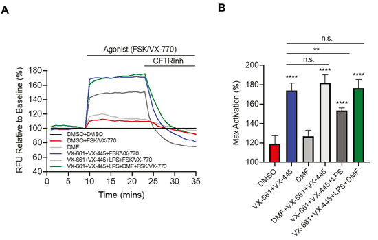 CFBE cells were grown at 37 °C for five days post-confluence submerged on 96-well clear bottom culture plates (Costar, New York, NY, USA) as previously described [22]. Cells were treated with 0.1% DMSO or 3 µM VX-661 + 3 µM VX-445 +/− 10 µg/mL LPS for 24 h. In parallel, 50 μM DMF either alone or in the presence of 3 µM VX-661 + 3 µM VX-445 for 24 h were tested. Then, cells were loaded with blue membrane potential dye and dissolved in a chloride-free buffer for 30 min at 37 °C [23]. The plate was then read in a fluorescence plate reader (FilterMax F5, Molecular Devices, San Jose, CA, USA) at 37 °C. After 5 min baseline, F508del-CFTR was stimulated using 10 µM forskolin (FSK, Sigma-Aldrich) and 1 µM VX-770. After 10 min, CFTR inhibitor (CFTRinh-172, 10 µM, Selleck Chemicals, Houston, TX, USA) was added to deactivate CFTR. The peak changes in fluorescence to CFTR agonists were normalized relative to the baseline fluorescence [24,25].