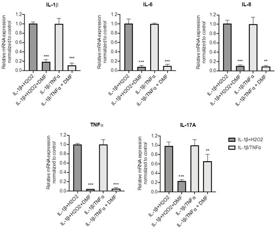 To better understand whether DMF is capable to dampen inflammation in CF cells, other pro-inflammatory stimuli were used, namely IL-1β + H2O2 and IL-1β + TNF-α. Both stimuli significantly increased IL-1β, TNF-α, IL-6, IL-8 and IL17A mRNA levels (Figure S3). Figure 4 shows that DMF co-treatment was able to abate cytokine expression under basal conditions and with both stimuli, in regard to IL-1β, IL-6, IL-8 and TNF-α. Notably, while IL-17A mRNA levels were decreased by 80% after IL-1β + H2O2 stimulation, a lower effect (−40%) was obtained with IL-1β+TNF-α.