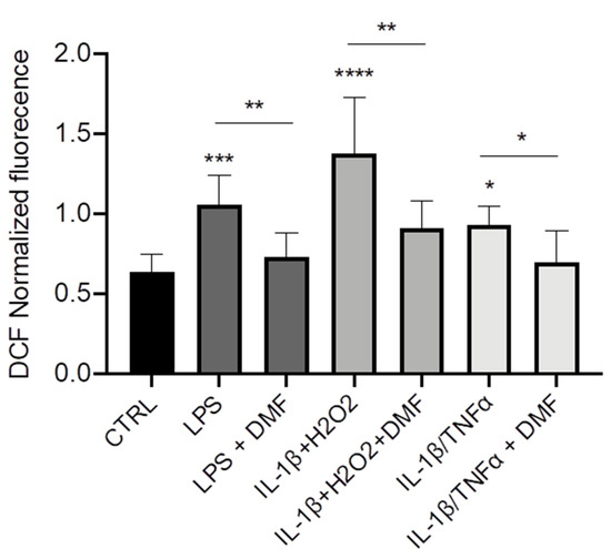 Cells (1 × 105 cells/well) were seeded in a 96-well plate and cultured for 48 h. Then, the cells were co-treated with 10 µg/mL LPS (Sigma) or 30 ng/mL IL-1β + 30 ng/mL TNF-α (R&D Systems, Minneapolis, MI, USA) or 30 ng/mL IL-1β + 100 µM H2O2 (R&D Systems, Minneapolis, MI, USA) +/− 50 µM DMF for 24 h. The cells were washed with PBS and changed to serum-free media and incubated with 10 µM o5-(and 6)-chloromethyl-2′,7′-dichlorodihydrofluorescein diacetate acetyl ester (H2DCFDA, Invitrogen, Waltham, MA, USA) for 30 min. The conversion of H2DCFDA to fluorescent DCF was measured using a plate reader (FilterMax F5) at 37 °C (excitation: 485 nm; emission 535 nm) [10,26].