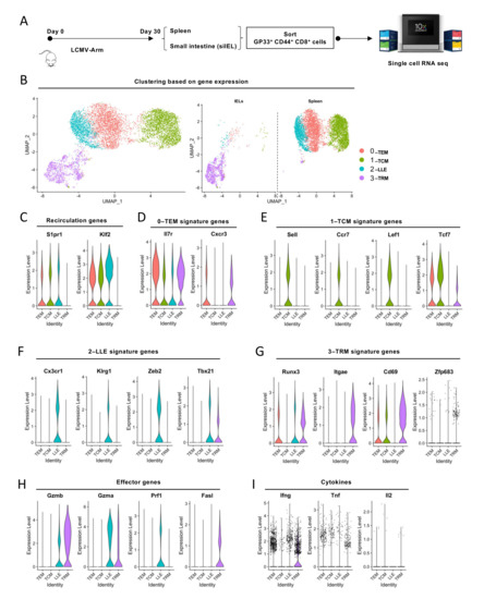 GP33+CD44+CD8+ cells were FACS-sorted from LCMV-ARM-infected mice on day 30 post-infection and loaded on the chromium controller (10× Genomics). scRNA-seq libraries were prepared using the Chromium Single Cell 5′ v1 Reagent Kit (10× Genomics) according to the manufacturer’s protocol. Libraries were loaded onto an Illumina NextSeq sequencing system with the NextSeq 500/550 High Output Kit v2 (150 cycles) (Illumina) with the following conditions: 26 cycles for read 1, 91 cycles for read 2, and 8 cycles for i7 index. Raw sequencing data were de-multiplexed and converted to gene-barcode matrices using the Cell Ranger (Version 2.2.0) mkfastq and count functions, respectively (10× Genomics). The mouse reference genome mm10 was used for alignment. Data were further analyzed in R (Version 3.4.0) using Seurat (Version 3). The number of genes detected per cell, number of unique molecular identifiers (UMIs), and the percent mitochondrial genes were plotted; outliers were removed (cells that expressed less than 200 and more than 2500 genes, and cells with >0.05 percent mitochondrial genes) to filter out doublets and dead cells. Differences in the number of UMIs and percent mitochondrial reads were regressed out. Raw UMI counts were normalized and log-transformed. We removed contaminating cells and kept α/β CD8+ T cells based on high expression of Cd3e, Cd8a, Trac, Trbc1, and Trbc2. To correlate our findings with previously reported TRM subsets, published scRNA-seq data on activated P14 T cells (CD8+ CD44+) cells from siIEL (GSE131847) [19,20] were used to perform intergraded analysis using Seurat.