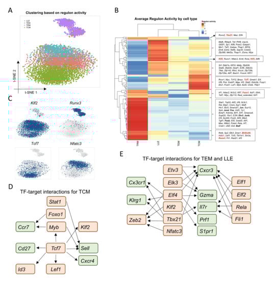 To comprehensively reconstruct the gene regulatory networks for different types of CD8+ T-memory subsets during acute viral infection, we applied network inference on our scRNA-seq data of LCMV-specific CD8+ T cells using SCENIC [21]. SCENIC predicts TFs alongside their candidate target genes, which are jointly called a regulon, via co-expression patterns and cis-regulatory motif analysis. Here, we identified 153 regulons that were active in at least 1% of the total cells from our scRNA-seq data. Then, the activity of these regulons was accessed in individual cells which were reclustered based on regulon activity patterns (Figure 2A). By then labeling each individual cell with its Seurat-derived cluster identity, we found that TRM cells harbor the most unique regulon activities while TEM, TCM, and LLE cells shared relatively similar regulon profiles (Figure 2A,B). Nevertheless, we found some regulon heterogeneity among the non-TRM populations, as expected. TCM cells lacked Tbx21 regulon activity but were enriched for Tcf7 regulon activity, which has been reported to regulate the stemness of TCM [28] (Figure 2B,C). Furthermore, we found that Tcf7 might program TCM cells through the regulation of signature genes, including Klf2, Id3, and Sell (encodes CD62L) (Figure 2D). TEM and LLE cells both had high activity of regulons related to T-cell migration and activation, such as Klf2, Klf3, and Nfatc3 (Figure 2B,C,E). We found that TFs, including Etv3, Elk3, and Elf4, may regulate Gzma and Gzmb expression to promote the cytotoxicity of LLE cells (Figure 2E). Furthermore, ELF4 has been shown to regulate the proliferation and migration of CD8+ T cells via KLF2 [35].