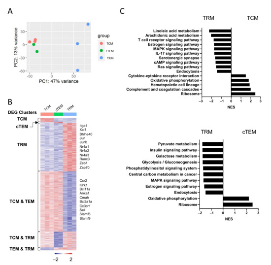 Bulk RNA-seq reveals the unique transcriptional profiles of TRM compared with TEM and TCM: (A) Principal component analysis (PCA) plot showing the top two principal components distinguishing the transcriptional profiles of three populations. (B) Heatmap showing the significantly (p.adjust < 0.05) differently expressed genes in each population. (C) Gene set enrichment analysis (GSEA) using the KEGG database revealed pathways up or downregulated (adjusted p-value < 0.05) in TRM compared with TCM or TEM.