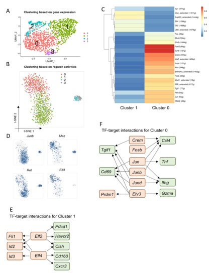 Having validated that our TRM populations match those previously reported, we sought to investigate the core regulatory programs that determine the molecular and functional heterogeneity of the two TRM subsets. To do so, we performed SCENIC analysis on GP33+ CD44+ CD8+ T cells from siIELs 30 days post-LCMV-ARM infection. Unsupervised clustering based on regulon activities resulted in two major cell clusters, which were highly correlated with their gene expression profiles (Figure 4A,B). Cluster 1 had high activity of regulons such as Yy1, Maz, Supt20, Elf2, Elf4, and Ubtf (Figure 4C,D). Based on predictions of target genes of each TF from SCENIC analysis, we found that Elf2 and Elf4 might promote expression of inhibitory receptors (Cd160, Pdcd1, and Havcr2 (encodes Tim3)), other TFs (Fli1, Id2, and Id3), Cxcr3, and Cish in Cluster 1 (Figure 4E). Cish is a member of the suppressor of cytokine signaling (SOCS) family, which has been shown to silence TCR signaling and suppress T-cell expansion, effector function, and cytokine polyfunctionality in CD8+ T cells [43]. Fli1 has been reported to function as a repressor of effector-cell differentiation during acute and chronic infection [38]. Therefore, Elf2 and Elf4 might be key TFs that regulate the quiescence of the memory-like TRM subset. Cluster 0 had high regulon activities of AP-1 TF family members, including Jun, Junb, Jund, Fosb, Fosl2, and Fos (Figure 4C,D). These were predicted by SCENIC to promote the expression of effector genes, such as Tnf, Ifng, and Ccl4 in the effector-like TRM subset (Figure 4F). Furthermore, the activities of Rel and Nfkb2, which belong to the NF-κB signaling pathway, were found to be enriched in Cluster 0 (Figure 4C,D). We also found that Elk4, Etv3, Crem, Maff, Atf4, Bhlhe40, Mxd1, Klf6, and Tgif1 were enriched in Cluster 0 (Figure 4C,D). By further checking the putative targets of these TFs, we found that Etv3 might regulate effector function by promoting Gzma and Prdm1 expression (Figure 4F). Crem has been reported to drive an inflammatory phenotype of T cells in patients with arthritis [44]. However, its role in regulating TRM heterogeneity is not clear. Together, these results revealed the gene regulatory networks that controlled the heterogeneity of TRM within the siIEL CD8+ T-cell pool.