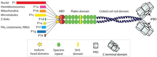 As shown by expression profiling, different types of cells and tissues express these isoforms in different combinations and proportions, often in dependence of their developmental stage [10,11]. The observation of distinct isoform expression patterns has been the basis for a working model where the expression of different sets of plectin isoforms is tailored for particular functional needs of the cell, in a kind of “custom-made” fashion. Important for the understanding of plectin’s multiple functions was the observation that the various isoform-specific N-terminal head domains dictate the cellular localization of the isoform [12], by docking to distinct interaction partners. A few isoform-specific interaction partners have indeed been identified; however, in several other cases, isoform-specific interaction partners and targeting mechanisms are still unknown. As all the isoforms are endowed with a universal high affinity IF-binding domain at their C termini, they will recruit and anchor IF networks of any type to the various sites and structures with which they are associated. This is an important concept, as it leads to an isoform-dependent interlinking of different cellular structures and organelles via IFs, with major implications for cytoarchitecture, shape, polarization, and migration potential of cells [4,5,6,13]; see Figure 1 for a schematic drawing of the plectin molecule and its diverse head domains).