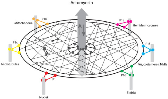Given the widespread expression of P1 in different tissues and types of cells [9,10,79], nuclear IF targeting through P1 can be expected to be a general mechanism applicable to cells expressing different types of IFs, including keratin networks. This does not exclude the possibility that other mechanisms, such as plectin-mediated or cytolinker-independent crosslinking of perinuclear IF networks [80], also play a role. In fact, the effectiveness of signaling through IF networks is likely to be based on a combination of a number of mechanisms, fine-tuned by the type of stress signals and composition of the mechanosensing machinery. In any case, the control of IF networks over the actomyosin filament system appears to depend heavily on plectin and its isoform-dependent location.