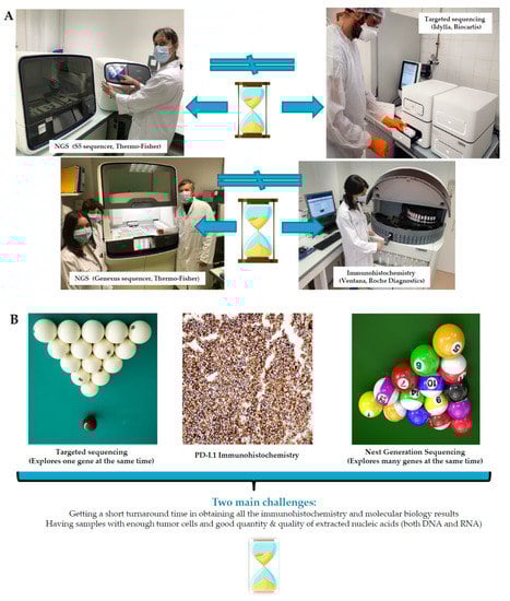 The results of biomarkers must be obtained within a delay that permits neoadjuvant treatments to be initiated, irrespective of the biological material. Thus, it is mandatory to avoid long delays in transmission of the results of PD-L1 immunohistochemistry and of the molecular biology, in particular for NGS analyses [95] (Figure 2A, B). Aside from genetic alteration in EGFR and ALK, NGS can identify other genomic alterations (in BRAF, RET, MET, ROS1, NTRK, HER2,), some of which can be harmful when neoadjuvant immunotherapy is used [96]. Given the possible intra-tumoral heterogeneity concerning the expression of PD-L1 and mutations in EGFR as well as some false negative results obtained with preoperative biological material, it is certainly interesting to repeat examinations for these biomarkers with surgical specimens in the case of a negative result in preoperative biopsies [97,98].