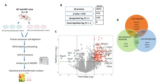 Proteomic analysis of a hepatocyte model of Niemann-Pick C disease. (A) Schematic representation of the experimental workflow. (B) Summary for the processing of data. (C) Volcano plot obtained from quantitative proteomics analysis. Red and green dots represent proteins that show a log2 fold change ≥ 1 and log2 fold change ≤ −1. Proteins tagged show log2 fold change ≥ 2 and log2 fold change ≤ −1. (D) Venn diagram depicting proteins tagged with a role in liver damage (orange circle), inflammatory response (green circle), and lipid metabolism (blue circle).