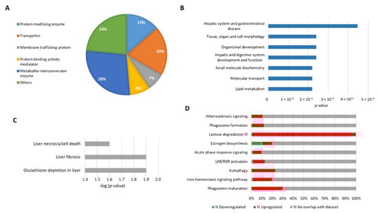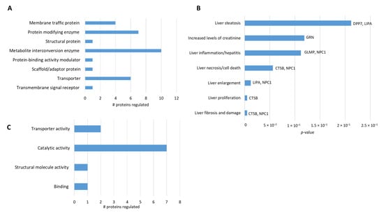 To place our experimental results within the context of biological functions we used the PANTHER Classification System (Available online: pantherdb.org, accessed from 13 July 2020). Considering 155 DEPs, our analysis revealed that 28% correspond to metabolic enzymes, 20% to transporters, and 13% to protein modifying enzymes (Figure 2A). Then, to elucidate significant correlations with pathological processes in which these proteins may participate, we used the IPA tool “Diseases and function”. We found that the most significant biological functions associated with our data were related to lipid metabolism, molecular transport, and hepatic system disease (Figure 2B). When we used the filter “Toxicity function” to identify changes related to hepatotoxicity, we found that many DEPs participate in liver fibrosis, necrosis, and depletion of glutathione (Figure 2C), confirming that NPC1 deficiency induces liver damage. This finding will help to attain a better understanding of the pathways that lead to liver damage in NPC disease.