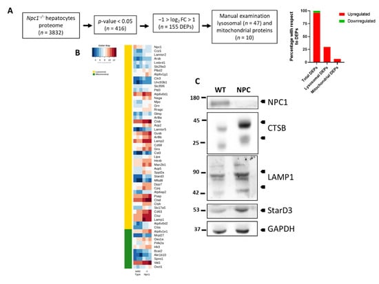 Lysosomal and mitochondrial proteins differentially expressed in hepatocytes from wild type and Npc1−/− mice. (A) Summary of the computational pipeline for proteome analysis and bar chart representation of the total, mitochondrial and lysosomal proteins that present changes in Npc1−/− hepatocytes. (B) Heat map presenting differentially expressed lysosomal and mitochondrial proteins in wild type and Npc1−/− hepatocytes (n = 3). (C) Western blot analysis of liver homogenates confirmed the decreased expression of NPC1 and increased expression of CTSB, LAMP1, and StarD3 proteins in 6 weeks old Npc1−/− mice (NPC) compared to wild type (WT) mice of the same age.