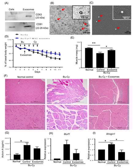 The diameter of exosomes was confirmed to be less than 100 nm by TEM (Figure 1B) and SEM analysis (Figure 1C). To identify the effects of T-MSC exosomes, mice were treated with Bu-Cy for cytotoxic conditioning as previously established and injected with T-MSC exosomes on the third day during Bu-Cy treatment. Rapid weight loss was observed until 4 days post-Bu-Cy injection, but T-MSC exosome injected Bu-Cy mice showed significantly milder weight loss (Figure 1D). This weight loss was accompanied with skeletal muscle loss as indicated by Figure 1E. The quadriceps muscle mass appeared to be decreased by Bu-Cy treatment, and T-MSC exosomes significantly rescued the chemotherapy induced muscle loss. Furthermore, quadriceps muscle tissue exhibited a clear disruption of muscle fibers and increased internalized nuclei in Bu-Cy mice, but T-MSC exosomes reversed muscle disruption induced by the conditioning regimen (Figure 1F). As activin A is a negative regulator of muscle mass, and elevated levels of activin A are reported during chemotherapy, we confirmed the levels of activin A in serum of each experimental mouse. As shown in Figure 1G, Bu-Cy treatment significantly increased circulating activin A. Thus, we detected expression of MuRF1 and Atrogin1, which are known activin A-induced muscle atrophy genes [,]. The expression of MuRF1 was upregulated in Bu-Cy treatment and decreased by T-MSC exosomes. Additionally, T-MSC exosomes significantly reduced Atrogin1 expression under Bu-Cy treatment (Figure 1H,I).