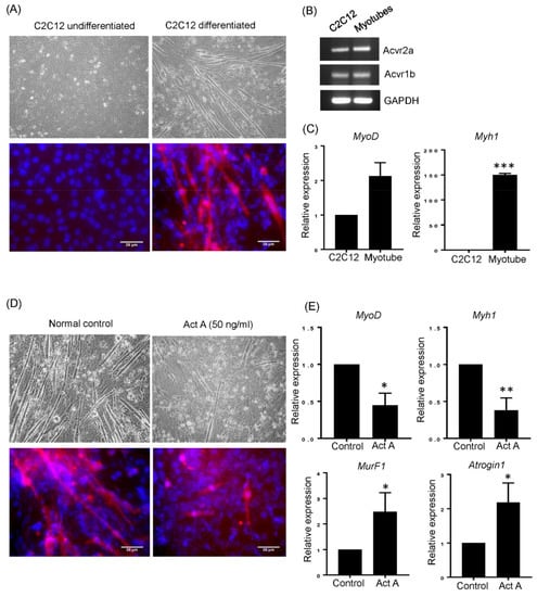 Activin A treated C2C12 cells showed impaired differentiation capacity. (A) C2C12 myoblasts (left) were differentiated and formed myotubes (right). The morphological changes were observed by phase contrast microscopy (Original magnification, 200×, upper panel). The expression of myogenin was confirmed by immunofluorescence staining (Myogenin (red) and DAPI (blue), lower panel). (B) C2C12 myoblasts and myotubes were harvested and the expression of activin A receptors ACVR2A and ACVR1B were detected by RT-PCR. (C) The expression of myogenic markers MyoD and MYH1 were detected by qRT-PCR. The data are presented as the mean ± SEM (*** p < 0.001). (D) C2C12 myoblasts were differentiated in the presence or absence of activin A (50 ng/mL) for 5 days, and visualized by phase contrast microscopy (Original magnification, 200×, upper panel). The expression of myogenin was confirmed by immunofluorescence staining (Myogenin (red) and DAPI (blue), lower panel). (E) The expression of myogenic makers (MyoD and MYH1) and atrophy genes (MuRF1 and Atrogin1) was detected by qRT-PCR in differentiated C2C12 cells without activin A (control) and in C2C12 cells differentiated in the presence of activin A. The data are presented as the mean ± SEM (* p < 0.05, ** p < 0.01).
