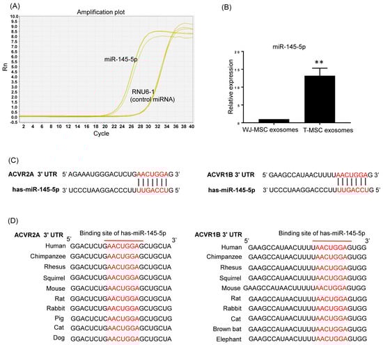 has-miR-145-5p is highly expressed in T-MSCs exosomes and directly targets ACVR2A and ACVR1B. (A) Amplification plot of has-miR-145-5p and control miRNA, RNU6-1 in T-MSCs exosomes from qRT-PCR (B) The relative expression of has-miR-145-5p in Wharton’s jelly MSCs exosomes and T-MSCs exosomes was quantified by qRT-PCR. The data are presented as the mean ± SEM (** p < 0.01). (C) The predicted binding site of has-miR-145-5p in ACVR2A 3′-UTR and ACVR1B 3′-UTR. (D) Sequence alignment of the mature has-miR-145-5p binding sites in multiple species.