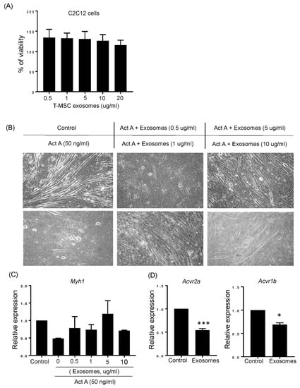 The maintenance of muscle mass in T-MSC exosomes in vivo led to us to confirm the effect of T-MSC exosomes on muscular differentiation in C2C12 myoblasts. Prior to treating exosomes, potential toxicity was checked by measuring cellular viability. As shown in Figure 4A, C2C12 cells treated with various concentrations of T-MSC exosomes had increased cell viability over 100%, as compared to untreated C2C12 cells set to 100%. Next, we tested whether T-MSC exosomes improved muscular differentiation in the presence of activin A. Confluent C2C12 myoblasts started differentiation and were treated with 50 ng/mL activin A and various concentrations of T-MSC exosomes (0.5, 1, 5, 10 μg/mL) on the first day of differentiation. After 5 days, cells treated with activin A alone showed limited formation of myotubes. Conversely, cells exposed to T-MSC exosomes formed abundant myotubes even in the presence of activin A (Figure 4B). The expression of the MYH1 skeletal muscle marker was also recovered in C2C12 cells treated with T-MSC exosomes under activin A exposure. In particular, we found that T-MSC exosomes most effectively increased MYH1 expression at a concentration of 5 μg/mL (Figure 4C). Considering the abundance of has-miR-145-5p in T-MSC exosome and potential activity on activin A receptors, ACVR2A and ACVR1B, we confirmed the expression of ACVR2A and ACVR1B in C2C12 cells treated with T-MSC exosomes for 24 h. Figure 4D shows that ACVR2A and ACVR1B were significantly downregulated in C2C12 cells with T-MSC exosomes added. Thus, T-MSC exosomes may improve activin A-induced impaired muscular differentiation, possibly by regulating activin A receptor expression.