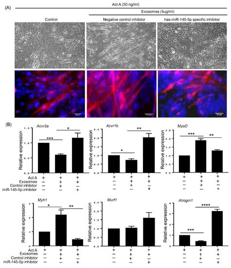 The supportive effect of T-MSC exosomes on muscular differentiation is reduced by has-miR-145-5p inhibitor. (A) C2C12 cells were differentiated into myotubes in the presence of activin A and T-MSC exosomes. To observe the effect of has-miR-145-5p, cells were transfected with non-targeted control inhibitor or has-miR-145-5p specific inhibitor. The phase contrast microscopy image was taken on day 5 of differentiation (Original magnification, 200×, upper panel). The expression of myogenin was confirmed by immunofluorescence staining (Myogenin (red) and DAPI (blue), lower panel). (B) The expression of activin A receptors (ACVR2A and ACVR1B), myogenic markers (MyoD and MYH1), and atrophy genes (MuRF1 and Atrogin1) were detected in experimental C2C12 cells by qRT-PCR. The data are presented as the mean ± SEM (* p < 0.05, ** p < 0.01, *** p < 0.001, **** p < 0.0001).