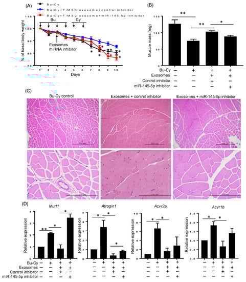 The in vitro experimental results prompted us to investigate whether T-MSC exosomes attenuate in vivo skeletal muscle loss in a has-miR-145-5p-dependent manner. We injected T-MSC exosomes supplemented with nonspecific or miR-145-5p-specific inhibitors during Bu-Cy treatment. Mice injected with T-MSC exosomes and nonspecific inhibitor on the third day showed significantly inhibited weight loss starting the day after their last Cy treatment. However, these effects were diminished in mice that received T-MSC exosomes and miR-145-5p inhibitor starting two days after their last Cy treatment. The co-administration of T-MSC exosomes and miR-145-5p inhibitor resulted in a sharp decrease in weight towards the end of the experiment (Figure 6A). T-MSC exosomes in combination with the has-miR-145-5p inhibitor also blunted the muscle mass of each experimental mouse, as shown in Figure 6B. Furthermore, T-MSC exosome injected mice had milder quadriceps muscle fiber disruption induced by Bu-Cy when activity of miR-145-5p was normally maintained (Figure 6C). Lastly, co-administration with the has-miR-145-5p-specific inhibitor and T-MSCs exosomes in Bu-Cy-treated mice reversed the expression of MuRF1 and Atrogin1 atrophy genes (Figure 6D). Mice treated with Bu-Cy showed significant increases in activin A receptors, ACVR2A, and ACVR1B, indicating that the state of the tumor microenvironment (such as activin A increase under chemotherapy) could augment activin A responsiveness. Parallel with in vitro results, T-MSC exosomes significantly downregulated ACVR2A and ACVR1B in Bu-Cy mice, possibly explaining how atrophy genes are attenuated by T-MSC exosomes. Also, the decrease of activin A receptors by T-MSC exosomes were milder when the has-miR-145-5p inhibitor was co-administered (Figure 6D).