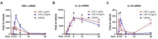 Microglial anti-inflammatory cytokine IL-10 mRNA peaks earlier than proinflammatory cytokines with a bimodal fashion upon LPS stimulation in vitro. Relatively increased mRNA levels of TNFα (A), IL-1β (B), and IL-10 (C) were measured by qPCR at 1 h, 2 h, 3 h, 6 h, 12 h, and 24 h after LPS (10 ng/mL or 1 µg/mL) treatment in cell cultures. Results were from 3 independent experiments performed. * p < 0.05, ** p < 0.01, *** p < 0.001, and # p < 0.0001 compared with vehicle group. Two-way ANOVA followed by Bonferroni post hoc multiple comparison test.