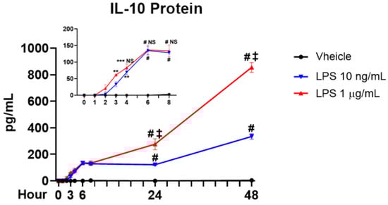 LPS-induced microglial IL-10 protein releases occur in a rapid manner. Supernatant levels of IL-10 were measured by ELISA at 1 h, 2 h, 3 h, 4 h, 6 h, 8 h, 24 h, and 48 h after treatment of LPS at 10 ng/mL or 1 µg/mL. The inset showed the expanded view of the same data within 8 h. Data were from 3 independent experiments. ** p < 0.01, *** p < 0.001 and # p < 0.0001 compared to vehicle group. NS (no significance) and ‡ p < 0.0001 compared with LPS 10 ng/mL group. Two-way ANOVA followed by Bonferroni post hoc multiple comparison test.