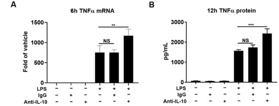 Neutralization of IL-10 enhances LPS-induced increase in TNFα mRNA and protein levels. Following the treatment of with LPS (1 µg/mL) with or without co-treatment of IgG or anti-IL-10 antibody (2.5 µg/mL) in cultures, levels of TNFα mRNA at 6 h point were assessed by qPCR (A), and supernatant TNFα protein concentrations were measured at 12 h point by ELISA (B). Results were from 3 independent experiments. ** p < 0.01 and *** p < 0.001 compared to the LPS group. One-way ANOVA followed by Bonferroni post hoc multiple comparison test.