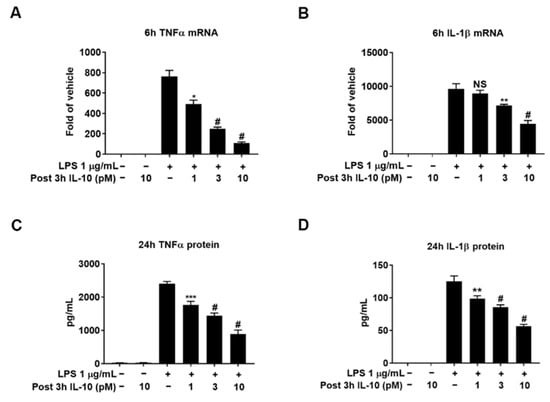 Picomolar IL-10 exerts potent inhibition on the expression of proinflammatory cytokines. Relative TNFα and IL-1β mRNA levels at 6 h were detected in cell cultures by qPCR with the addition of recombinant IL-10 at 1, 3, and 10 pM 3 h after LPS at 1 µg/mL treatment (A and B). Supernatant protein concentrations of TNFα and IL-1β were measured by ELISA with the same treatment (C and D). Data were from 3 independent experiments. NS, * p < 0.05, ** p < 0.01, *** p < 0.001, and # p < 0.0001 compared with the LPS group. One-way ANOVA followed by Bonferroni post hoc multiple comparison test.