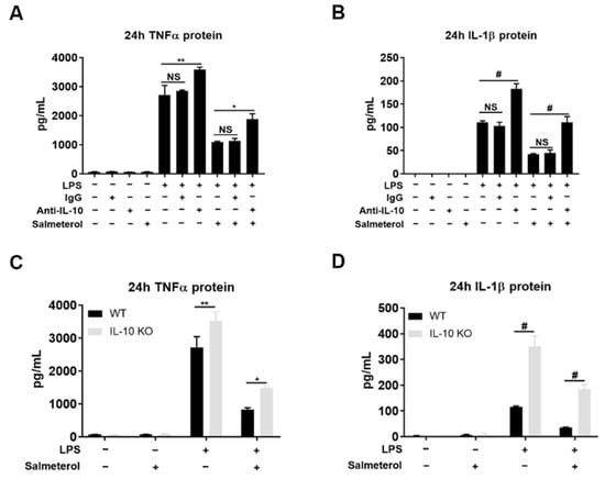 IL-10 deficiency impairs inhibitory potency of salmeterol on LPS-elicited increase in proinflammatory cytokines. Supernatant protein concentrations of TNFα (A) and IL-1β (B) were detected by ELISA at 24 h after treatment of LPS 1 µg/mL, IgG 2.5 µg/mL, anti-IL-10 antibody 2.5 µg/mL, and salmeterol 10−9 M as indicated. Supernatant levels of TNFα (C) and IL-1β (D) were measured by ELISA at 24 h after LPS 1 µg/mL, and salmeterol 10−9 M treatment as indicated in wildtype and IL-10 KO mixed glial cultures. Data were from 3 independent experiments. * p < 0.05, ** p < 0.01, and # p < 0.0001. One-way ANOVA (for picture A and B) or Two-way ANOVA (for pictures C and D) followed by Bonferroni post hoc multiple comparison test.