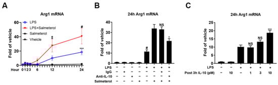 IL-10 involves salmeterol-upregulated Arg1 mRNA expression in the presence of LPS. Relative Arg1 mRNA in cell cultures were assessed by qPCR at 1 h, 2 h, 3 h, 6 h, 12 h, and 24 h after LPS 1 µg/mL and salmeterol 10−9 M treatment as indicated (A). Results were from 3 independent experiments. *** p < 0.001 compared to vehicle group; ‡ p < 0.001 and # p < 0.0001 compared to LPS group. Two-way ANOVA followed by Bonferroni post hoc multiple comparison test. Relative Arg1 mRNA was measured in cell cultures by qPCR at 24 h after LPS 1 µg/mL, salmeterol 10−9 M, and anti-IL-10 antibody treatment as indicated (B). Results were from 3 independent experiments. NS, * p < 0.05 and # p < 0.0001 compared with LPS plus salmeterol group. One-way ANOVA followed by Bonferroni post hoc multiple comparison test. Relative Arg1 mRNA was detected in cell cultures by qPCR at 24 h after LPS 1 µg/mL, with post-3 h treatment of recombinant IL-10 protein at different concentrations as indicated (C). Results were from 3 independent experiments. NS and *** p < 0.001 compared to LPS group. One-way ANOVA followed by Bonferroni post hoc multiple comparison test.