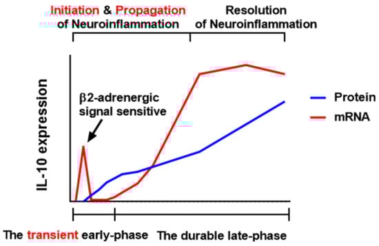 Schematic drawing the relationship between the stage of neuroinflammation and IL-10 expression. Upon TLR4 activation, IL-10 expresses rapidly other than in a previously reported delayed manner. Early-expressed IL-10 releases at very low levels compared to the late-phase but exert powerful regulatory effects on LPS-elicited neuroinflammation. A unique bimodal transcriptional fashion of IL-10 underlies the temporal pattern of IL-10 secretion. The transient early-phase of IL-10 mRNA induction grants the quick release of a low quantity of IL-10 to precisely modulate the initiation and propagation of neuroinflammation while the durable late-phase of IL-10 mRNA transcription sustains the delayed production of a high quantity of IL-10 to facilitate the resolution of neuroinflammation. The β2-adrenergic signal potentiates the early- but not late-phase of IL-10 induction. It suggests that the phase-specificity should be considered when investigating regulation mechanisms of a certain compound for microglial IL-10 expression.