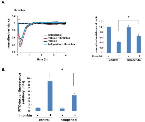 To investigate the effects of haloperidol on EC barrier regulation, we initially measured transendothelial electrical resistance (TER) in ECs pretreated with haloperidol prior to thrombin stimulation. These studies confirmed that maximal barrier disruption post-thrombin was significantly attenuated by haloperidol (Figure 2A).