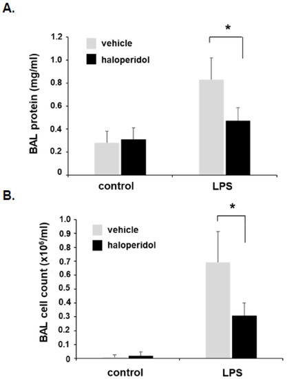 Murine ALI is attenuated by haloperidol: BAL fluid protein and cell counts. Mice were pretreated with haloperidol (4 mg/kg, IP) or vehicle 24 h prior to repeat treatment of the same, followed by the administration of intratracheal LPS (1.25 mg/kg). BAL fluid was collected 24 h later and assessed for (A) total protein content and (B) total cell counts (n = 5/LPS groups, * p < 0.05).