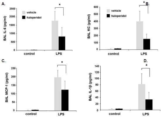 Murine ALI is attenuated by haloperidol: BAL fluid cytokines. Mice were pretreated with haloperidol (4 mg/kg, IP) or vehicle 24 h prior to repeat treatment of the same followed by the administration of intratracheal LPS (1.25 mg/kg). BAL fluid was collected 24 h later and assessed for inflammatory cytokines including (A) IL-6, (B) KC, (C) MCP-1, and (D) IL-1β. (n = 5/LPS groups, * p < 0.05).