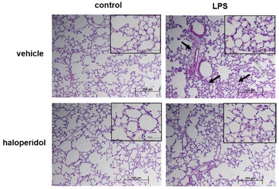 Murine ALI is attenuated by haloperidol: lung histology. Mice were pretreated with haloperidol (4 mg/kg, IP) or vehicle 24 h prior to repeat treatment of the same followed by the administration of intratracheal LPS (1.25 mg/kg). Lungs were harvested and utilized for histology evaluation. LPS-induced inflammatory cell infiltration and interstitial edema (arrows) was less evident in animals that were pre-treated with haloperidol (representative 10× images shown with 40× inset).