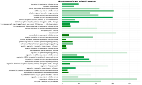Enriched biological processes terms involved in oxidative stress and death by differentially expressed genes (DEGs) found in HCN-2 cells after exposure to SARS-CoV-2. For each Gene Ontology term represented, the length of the bar shows the number of DEGs observed in that specific category. The color of the bar points to the ratio between the number of DEGs found in our analysis and the number of genes included in the term from white (no DEGs of the term) to green (all DEGs of the term). The terms are alphabetically sorted.