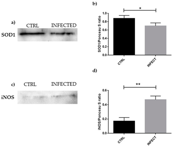 In order to quantify the proteins in the culture medium, cold acetone was added to the culture medium in a proportion of 4:1 and incubated at −20 °C. After 1 h, the tube was centrifuged at 14,000× g for 12 min at 4 °C. The supernatant was discarded, and the pellet was resuspended in RIPA buffer. Bradford Assay (Bio-Rad, Hercules, CA, USA) was used to determine the protein concentration. After quantification, an equal amount of protein from control and from infected culture medium was subject to SDS-PAGE and blotted on polyvinylidene fluoride membranes (PVDF) (Immobilon-P transfer membrane; Millipore, Burlington, MA, USA). Ponceau S stain was used to confirm that the proteins were loaded in an equal amount. Blocking of nonspecific binding was performed by incubating the membranes with TBS + 5% skimmed milk for 1 h at room temperature. Primary antibodies used for overnight incubation at 4 °C were anti-superoxide dismutase 1 (1:1000; Abcam, Cambridge, UK; ab16831), anti-caspase 3 (1:1000, Cell Signaling, Danvers, MA, USA; #9662), anti-cyclooxygenase 2 (1:500; Santa Cruz Biotechnology, Dallas, TX, USA; sc-166475), and anti-nitric oxide synthase (1:500; Santa Cruz Biotechnology, Dallas, TX, USA; sc-651). The secondary antibody used for 1 h room temperature incubation was mouse anti-rabbit IgG-HRP (1:2000; Santa Cruz Biotechnology, sc-2357) or chicken anti-mouse IgG (1:2000; ThermoFisher Scientific, Waltham, MA, USA; cat. num. SA1-72021). An ECL system (Luminata Western HRP Substrates; Millipore) was used to visualize protein bands; then, acquisition was done using ChemiDoc MP System (Bio-Rad, Hercules, CA, USA), and ImageJ (National Institute of Health) was used to quantify them.