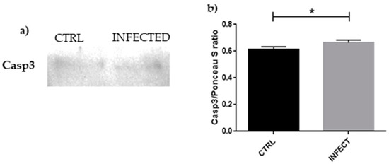 (a) Evidence of significant increase in caspase 3 expression in HCN-2 culture medium after SARS-CoV-2 infection, suggesting that apoptosis is taking place in the infected cells; (b) densitometric analysis of caspase 3, * p < 0.05.