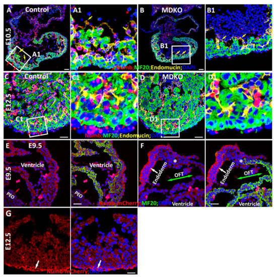 Spatiotemporal expression of Numb during myocardial morphogenesis. (A(A1)–D(D1)) Numb is expressed in epicardial cells, endocardial cells and cardiomyocytes at E10.5 and E12.5 (A(A1),C(C1)). The specificity of Numb in RNAScope and relative enrichment in endocardial cells is confirmed and observed in the MDKO (B(B1),D(D1)). Red arrows point to the cardiomyocytes and yellow arrows point to the endocardial cells in (A–D). (E,F) The Numb expression pattern was further determined by a mCherry::Numb knockin line. Numb is not enriched in pro-epicardial cells at E9.5 (E) but is enriched in epicardial cells at E12.5 (F). Numb is ubiquitously expressed in trabecular and compact cardiomyocytes and did not display an asymmetric distribution between them (E,F). Epicardial cells are enriched with Numb (G). Red or white arrows point to the cells that express Numb. * Indicates a transition from MF20 negative cells to MF20 positive cells in OFT. Scale bars: 100 μm.