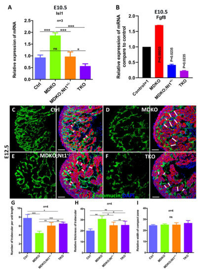 NFPs regulate progenitor cell differentiation and trabecular morphogenesis partially through Notch1. (A) Isl1 expression is significantly reduced in TKO compared to MDKO at E10.5 based on Q-PCR. (B) Fgf8 expression is significantly reduced in TKO compared to MDKO at E10.5 based on Q-PCR. (C–I) show that MDKO hearts display trabeculation defects with thicker trabeculae and a smaller number of trabeculae per unit length (D,G–I). One or both alleles deletion of Notch1 partially rescued the trabeculation defects that appeared in MDKO (E–I). * 0.01 < p < 0.05, ** 0.001 < p < 0.01, *** p < 0.001. ns, not significant. Scale bars: 100 μm.