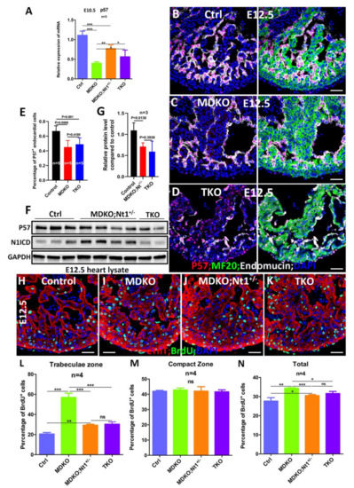 NFPs regulate p57 partially through Notch1. (A) P57 is downregulated in MDKO, and the abnormal expression of p57 was partially corrected in TKO based on Q-PCR. (B) P57 was mainly expressed in endocardial cells at E12.5. (C–E) The expression of p57 in MDKO and TKO was reduced compared with control. (F–G) The p57 expression was reduced in both MDKO; Nt1+/− and TKO based on western blot. (H–N) BrdU pulse labeling showed that cardiomyocyte proliferation increased in MDKO trabecular zone (I,L) compared with control (H,L). Cardiomyocytes proliferation rate in MDKO; Nt1+/− and TKO trabecular zone decreased significantly compared to that in MDKO, but is still higher than that in control (J–L). Compact zone cardiomyocytes proliferation rate among four types of hearts didn’t show a significant difference (H–K,M). * 0.01 < p < 0.05, ** 0.001 < p < 0.01, *** p < 0.001. ns, not significant. Scale bars: 100 μm.