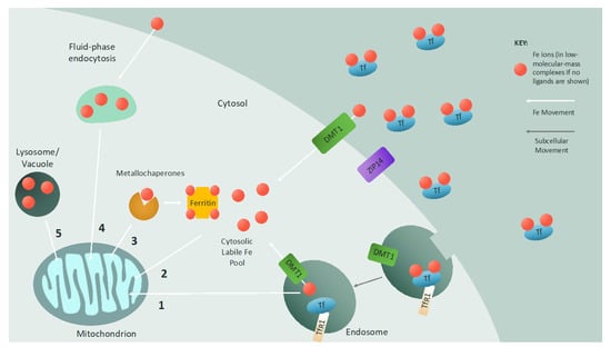 For further discussion of cellular iron uptake and distribution, readers are referred to comprehensive reviews on this topic [,,,,,,].